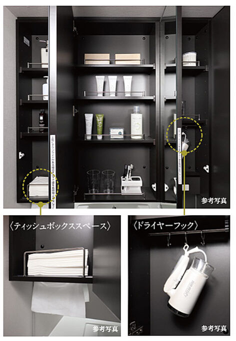 化粧品や洗面用具の収納にピッタリのスペース。ドライヤーフックや下から引き出せて使いやすいティッシュボックスの設置スペースやコンセントを設け、使い勝手の良さを高めています。