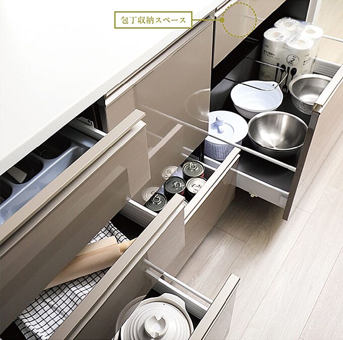 大容量で中身が見やすく出し入れが簡単な引き出し式のキッチンキャビネット。また、ゆっくりと扉が閉まるソフトクローズ機能を採用。閉まる際の衝撃を和らげ、不快な音を抑えます。※ソフトクローズ機能の採用は一部の引き出しを除きます。※参考写真