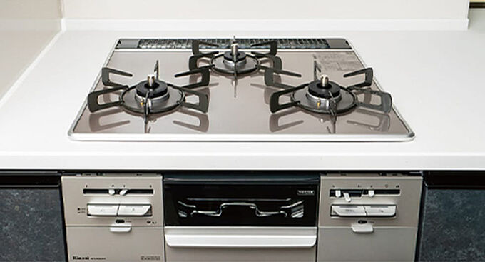 トロ火から強火まで火力調節幅が広めの3口コンロと、調理時間を短縮できる無水両面焼きグリルを採用。全口温度センサー付で安全にも配慮し、機能性と安全性を両立しました。※参考写真