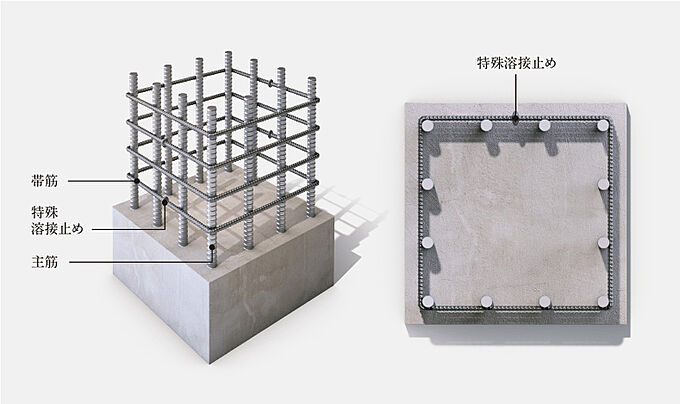 建物を支える柱の主筋を水平方向に束ね、主筋とコンクリートを拘束する役割を果たす外周部の帯筋には、溶接閉鎖型帯筋を採用。通常の帯筋に比べ、せん断力に対する拘束力が高く、建物に粘り強さを持たせます。※image