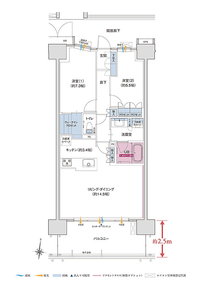 ※バルコニーの奥行は、壁の中心から手すり壁の中心までの寸法であり、実際に使用できる寸法とは異なります。