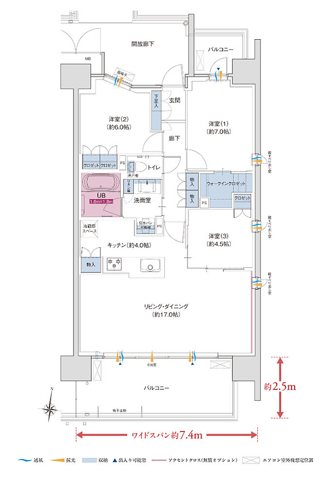 タイプ A 所在階数 - 価格 - 間取り 3LDK+WIC 専有面積 74.95㎡ バルコニー 17.94㎡ 備考 ■3面採光2面バルコニーの明るい角住戸