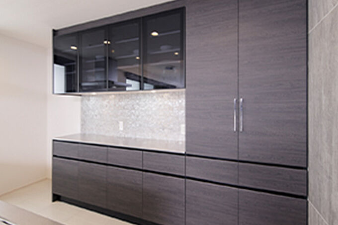 キッチンと連動することもあり、多くの収納スペースが望まれるダイニングの壁面とカウンター下に設置。キッチン小物や日用品の整理整頓に便利です。