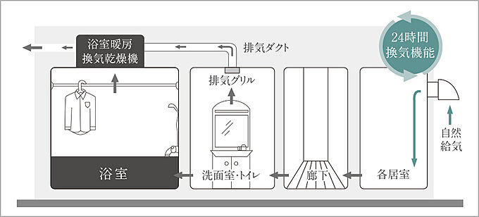 浴室暖房換気乾燥機を活用した24時間低風量換気システムを採用しています。各居室の換気スリーブより新鮮な空気を取り入れ、浴室・洗面室・トイレから汚れた空気を排出します。住戸内全体をいつも新鮮な空気で満たすことができます。