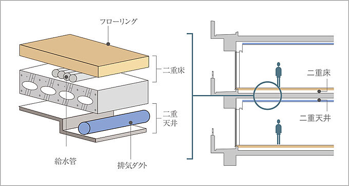 マンション上下間の戸境床であるボイドスラブに対して、上下住戸の天井材や床材で空間を設けて二重構造にしたものを、二重床・二重天井と呼びます。二重構造にすることで、床下や天井裏に給水管や換気扇のダクトなどの配管類を収めやすくなり、将来のメンテナンスやリフォームが行いやすくなります。