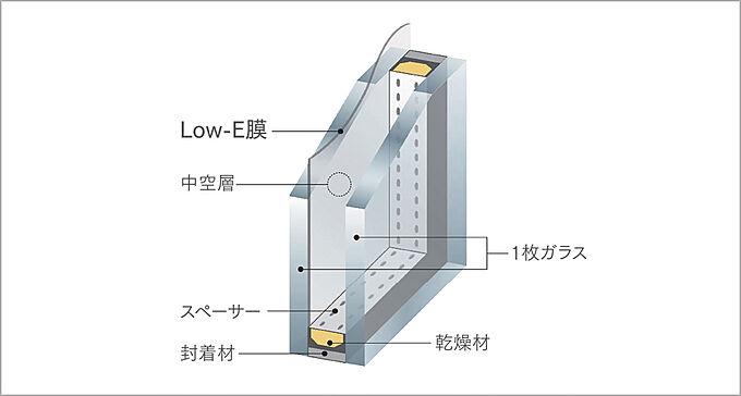 熱エネルギーの吸収・放射率を低くするために、内側ガラスの空気層側に特殊金属膜を設けたLow-E複層ガラスを採用。熱を通し難く、遮熱性・断熱性が高いのが特徴です。夏の日差しや寒い冬にも、快適な室内環境を保つことができます。※image