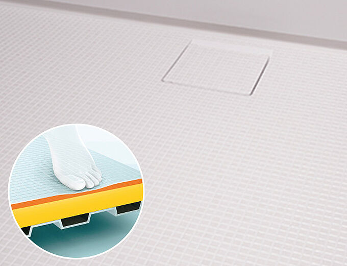 お掃除ラクラクほっカラリ床(タイル調)はクッション層が畳のやわらかさを実現。同時に断熱材の役割も果たします。床表面に特殊処理を施し、汚れ落ちがスムーズに。※image
