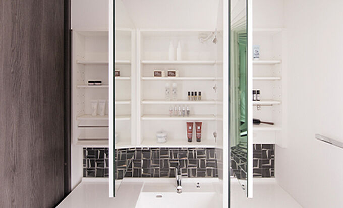 鏡は、くもり止めヒーター付き。上下にモザイクタイルを配し、上質感を演出します。また大容量の収納には、化粧品や洗面小物をキレイに整理できます。